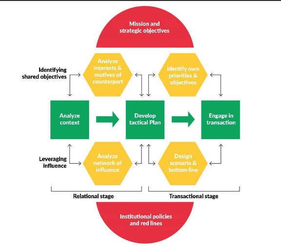 First we analyse the context and find shared objectives as well as a leverage of influence to get to our goals. If there are big disagreements such as not wanting to help communities problems can arise. A tactical plan has to be designed to help on the ground and then engage in a transaction→positive communication (breaking the ice using what your seller is fond of and offering a gain). Also be sure if you are a liability or an asset in a negotiation, e.g if you know the seller personally and he knows your family and etc… you might be more of a liability.
