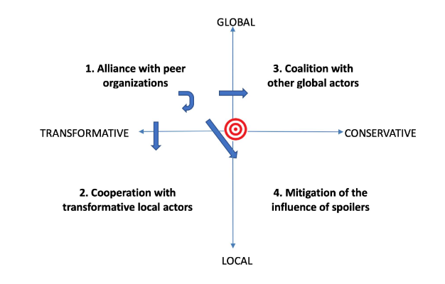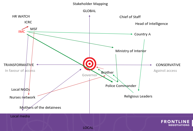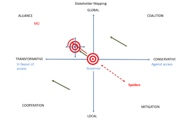 We map stakeholders based on whether they are transformative or conservative, local or global. This compared to the governor, which we negotiate with and is in the center. Dots then have to be connected to map a path of influence towards the governor through pressuring more conservative actors f.ex.