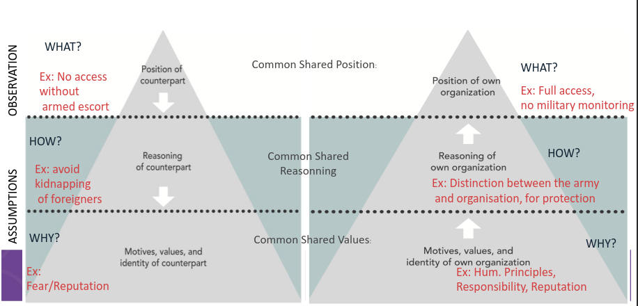 Basically there is a space between red lines of actors because there are also shared values and reasoning. As such there is a potential for shared solutions like escorts dressed as civilians so as to not alter perception of humanitarian actors and have them harmed. If there is no solution there will be no access, we will stay stuck so it’s important to find a proper solution. You can also openly denounce on the media the lack of flexibility if you are desperate if you can’t find any type of agreement even trough influence networks. You’ll probably fully lose access then.