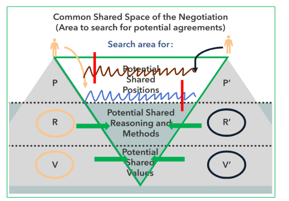 - Building a trusted relationship with the counterpart while exploring areas of consensus or compromises on values, methods and positions.