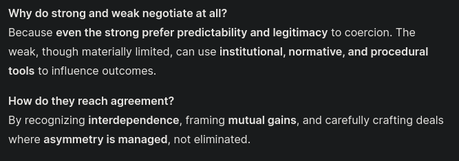 How and why do the weak and strong negotiate in order to come to a mutually acceptable agreement, and why do they do so anyhow, if the strong is strong and the weak is weak? (Zartmann 2008, Chap. 6)