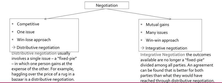 - Distributive = Fixed pie, win-lose, coercion, salami tactics.