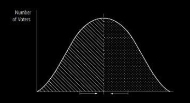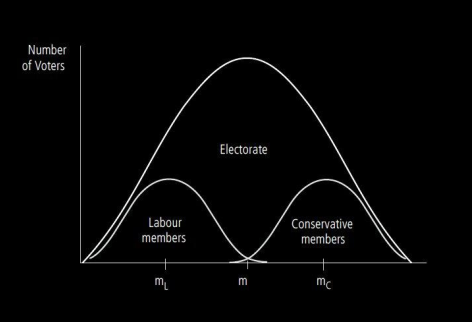 • The median voter theorem: To win a majority, a party (or coalition) needs to win the vote of the voter who has in the middle of the ideological distribution. This will induce a moderation of right and left parties (Downs 1957, see below).