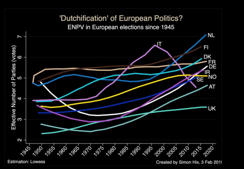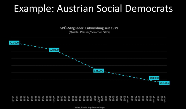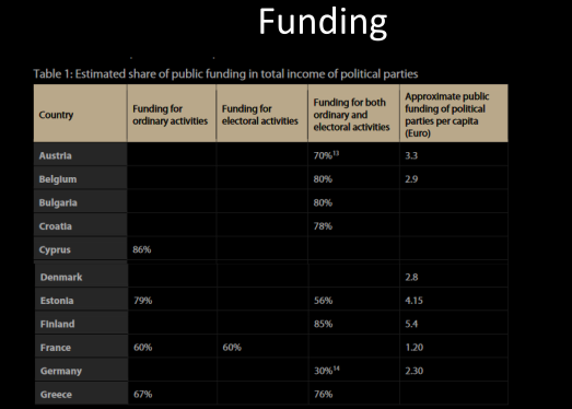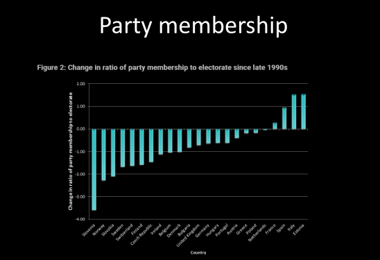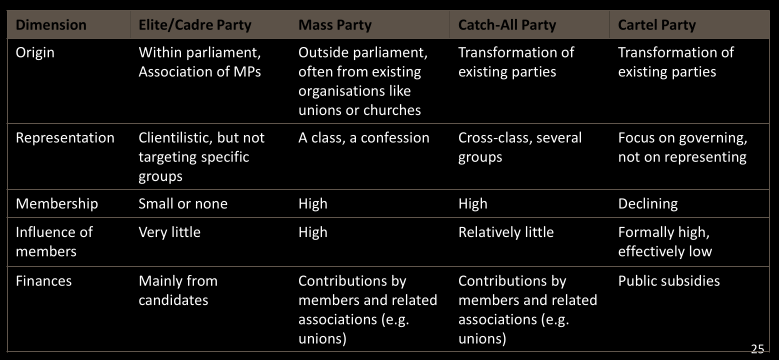 • Less and less integrated with civil society and closer leaning to the state integration. Member of parties are still people that’d work in fields relative to their position (those in worker movements would be workerscraftmans etc… f.ex.). Nowadays they are very professionalised, they work in politics. Mostly funded by the state in many countries (50%+ from taxpayers). Thus: Hence we see the emergence of a new type of party, the cartel party, characterised by the interpenetration of party and state, and also by a pattern of inter-party collusion. In this sense, it is perhaps more accurate to speak of the emergence of cartel parties, since this development depends on collusion and cooperation between ostensible competitors, and on agreements which, of necessity, require the consent and cooperation of all, or almost all, relevant participants.