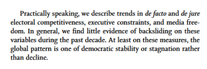 Problem: can hardly be used to measure change within single countries (except for 3→media freedom). Backsliding does not immediately start with rules changing in many countries.