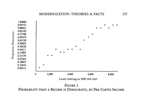 - S.M. Lipset (1957, 1959): The more well-to-do a nation, the greater the chances that it will sustain democracy.