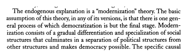 Basically the same arguments for the endogenous theory but kind of in a reversed mechanic. Plus, wealthy democracies can absorb shock and provide public goods which reduces loss of faith in the current system. This allows a solidification of the norms and rules in place as time goes by which makes backsliding (authoritarianism in the case of this paper), unlikelier.