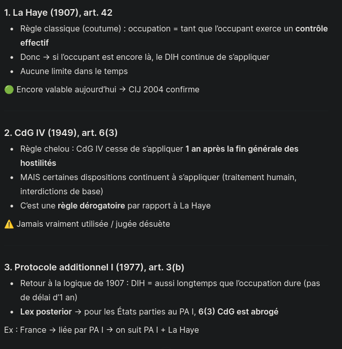 - La règle conventionnelle de 1949 (CG→DIH finit un an après occup), qui déroge au droit coutumier issu de 1907 (Haye→fin effective occup), est elle-même supplantée par la logique du PA I de 1977 (tant que nécessaire), bien que ce dernier n’aie jamais été appliqué en pratique.
