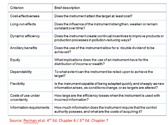 - Each available instrument can be characterised by a set of attributes, relating to such things as impacts on income and wealth distribution, the structure of incentives generated, and the costs imposed in abating pollution.