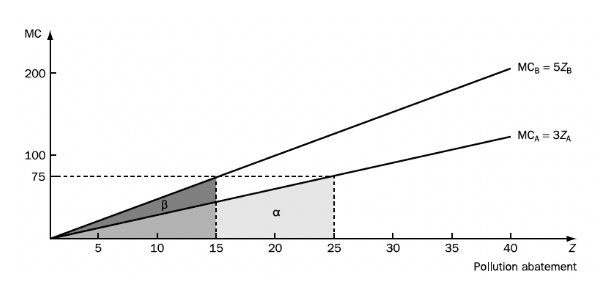 The least-cost solution is obtained by finding levels of ZA and ZB which add up to the overall abatement target Z = 40 and which satisfy the least-cost condition that MCA = MCB: