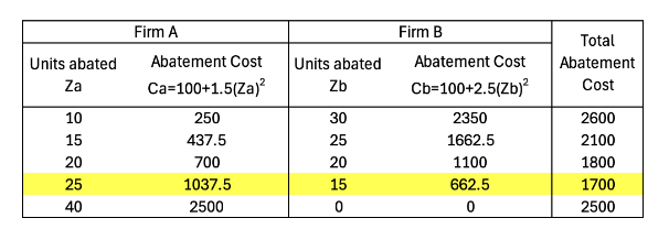 - One might think that as firm A has a lower marginal abatement cost schedule than B it should undertake all 40 units of abatement.