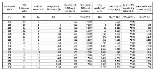 - The firm would minimise its cost by choosing to clean up ten units of pollution and to emit five units.