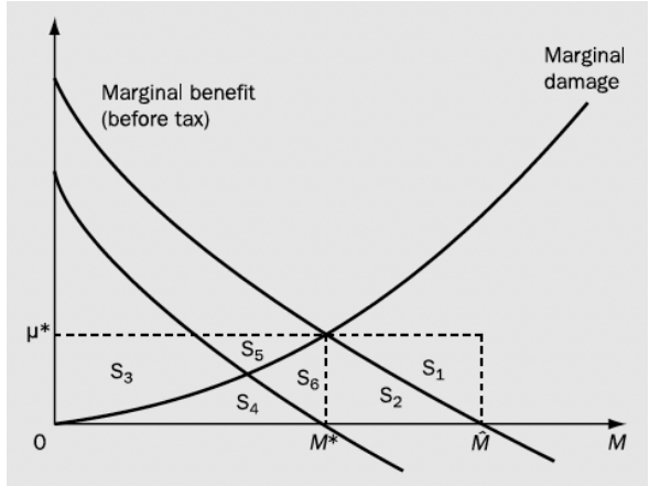 - Once the tax is operative, profit maximising behaviour by firms leads to a pollution choice of M∗, rather than ˆM as was before the tax.