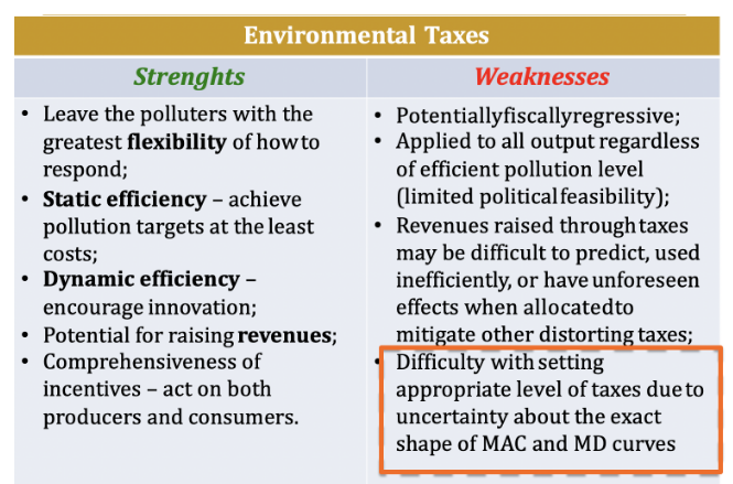- Emission taxes: levied on the pollutant itself (tax on SO2 emissions);