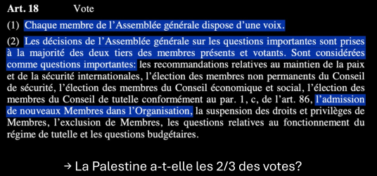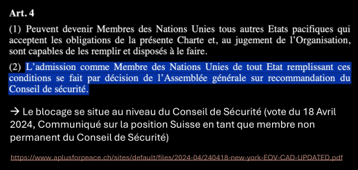 Ils ont déjà essayé, sans succès en 2012 en s’appuyant sur un support global. Les USA n’ont même pas eu à mettre leur véto, en 2024 oui ils ont dû. Cela puisqu’ils suivent Israel mais aussi que dans le processus de négociation, si on reconnaît la Palestine comme état membre on légitime une approche plus conflictuelle dans le problème ISR-PAL et le Hamas. La Suisse s’est même abstenu en disant être neutres, mais pas vraiment une action qui l’est ou qui a été perçue de cette manière. S’abstenir dans quelque chose aussi sensible c’est prendre position, on peut pas être réellement neutres au CdS.