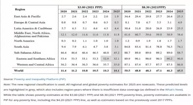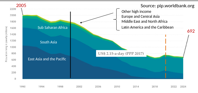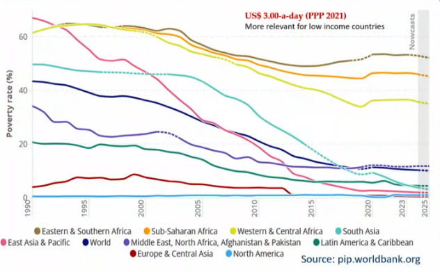 Substantial reductions in poverty in East Asia and the Pacific and South Asia (rapid growth and development of China and India has helped lift millions of people out of poverty). PPP as computed in 2021 is indicated, not done in an annual basis as it requires purchasing power index for many countries. In 2026, the reference is 2021 and the threshold (ITS 3$ PER DAY, TYPO) used is from last year.