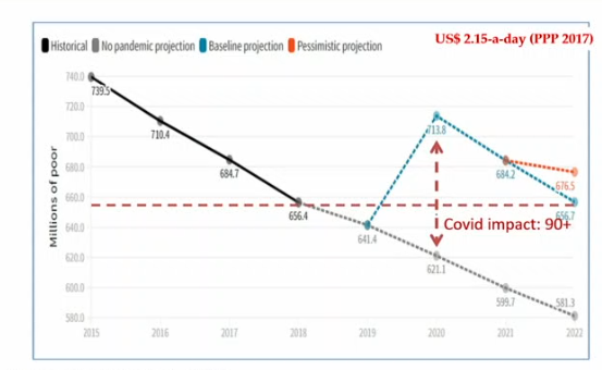 The poverty line changed relative to it’s expected trajectory. If we had no additional global shocks (in this case climate change) the recovery would have been even better (blue line). Either way it’s a projection from 2021/2.
