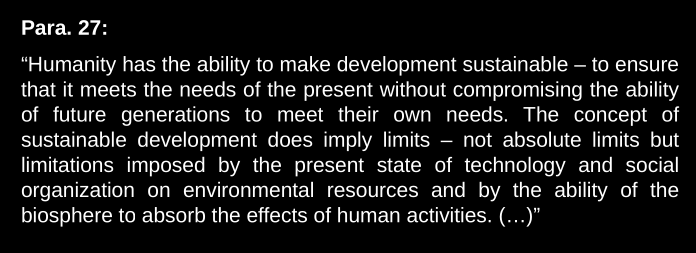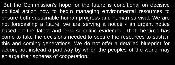 They underline, not prediction but notice based on the latest best scientific evidence. It was the time to take decisions which were needed to secure present resources. It does not give a blueprint but a pathway, concrete solutions were missing→NEW AGENDA to enlarge spheres of cooperation. The pathway is sustainable development.