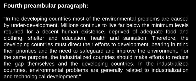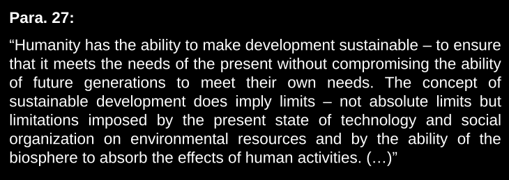 It is the origin of IEL but not of SD, no mention at all. We can see it was based on an imbalance between environmental protection and economic development. F.ex. principle 4 which says that nature conservation must receive importance but isn’t talking about balancing.