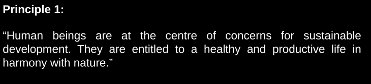 The very first principle codifies a right explaining that they are at the centre of concerns for SD and doesn’t even define it. It does let us extrapolate that it has the fulfilment of this right birthed from anthropocentric approaches as its goal. Comes from Stockholm.