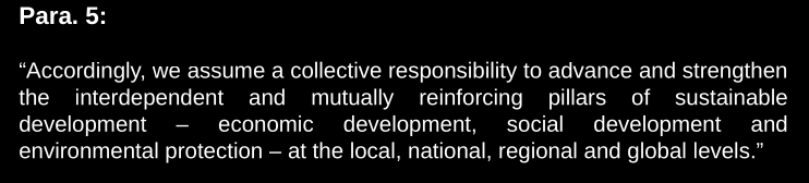 Interdependent and mutually reinforcing pillars of sustainable development, economic development, social development and environmental protection. Because in Rio the social development pillar of sustainable development was forgotten. It’s not only about 2 reinforcing and interdependent pillars but 3.