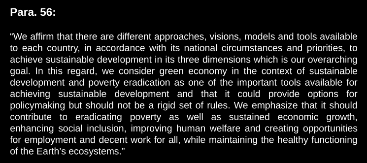 Sustainable development is about green economy… but here we say there are different tools, approches, etc… according with circumstances and priorities nationally to achieve sustainable development. It was kinda given up on. It became a self-judging concept.