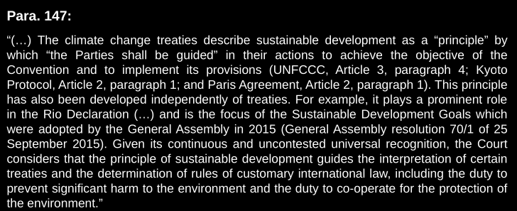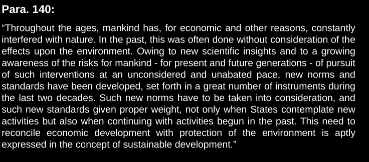Recognises intergenerational equity and the efforts in the last 2 decades to develop new norms and standards. It makes it clear that a new era has started, where there is a need to reconcile, not confront or clash, economic development with environmental protection. The court qualifies it without hesitance, but doesn’t say what its legal character is, only that it is a concept (names it sustainable development so references it). And it admits it is also applicable to past activities. It gives it retroactive effect. Quite the paradox.