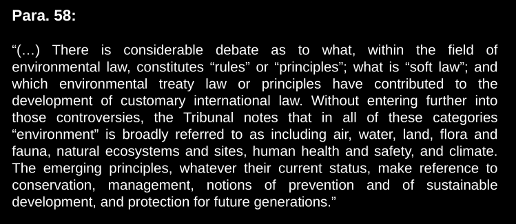 The award admits lack of consensus: what are laws, principles, what treaties have contributed to customary law…? But it stays outside the controversies. It does say there are emerging principles. It doesn’t get legalistic though. Among those emerging principles, it identifies 1.