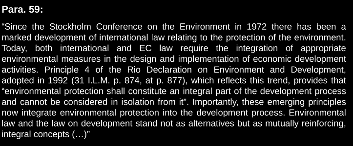 It says since Stockholm there has been marked development. So today international law requires to integrate economic development with environmental measures. This is customary international law language. No matter the status of the emerging principle this means it has customary law effects. Case law therefore says clearly it is about integration. Development and environment law are not alternatives but mutually reinforcing and integral concepts. Clear as day.