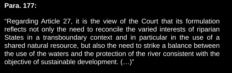 Hungary explained it wasn’t a developmental project as it harmed the environment and Slovakia said it was in its right to develop for more hydroelectric energy. It is the first sustainable dispute ever really. The court felt it was important to send a strong message to the international community therefore.