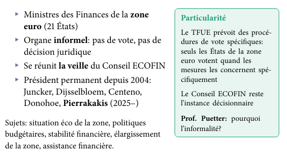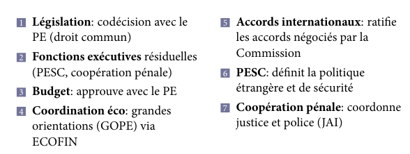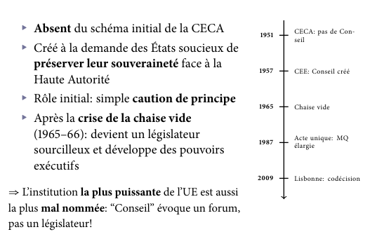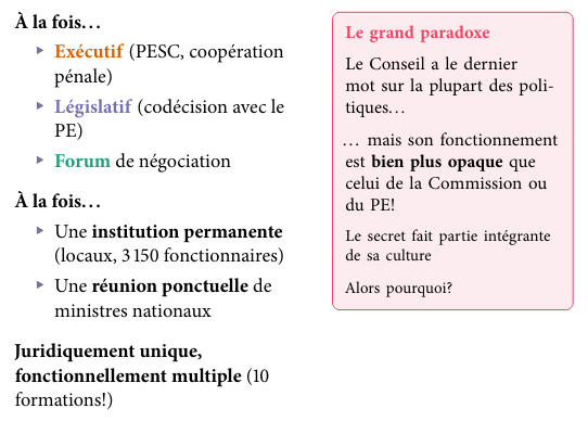 Institutions créées ad hoc organiquement et donc compétences pas si claires comme dans les états. Il est exécutif pour l’intérieur et l’extérieur, il négocie pendant la crise de la zone euro pour trouver des solutions à des problèmes difficiles (logiciel intellectuel).