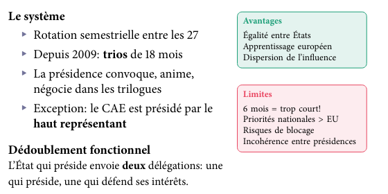 Il y a quand même des blocages comme avec trump, aussi des changements de gouvernements qui créent de l’incohérence. C’est pas la même chose la présidence Orban ou celle de Sarkozy qui a fusionné national et supranational en projetant la diplomatie française lors de la crise de géorgie-RSS. Toutes les présidences ne jouent pas le même rôle : certaines restent neutres, d’autres cherchent à promouvoir leurs priorités nationales.