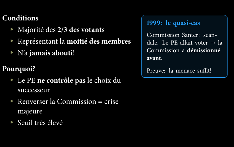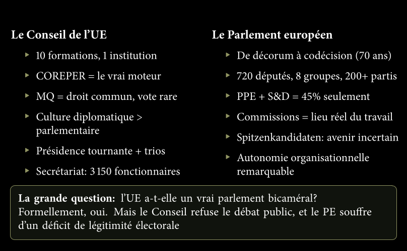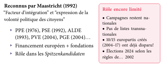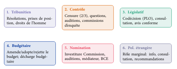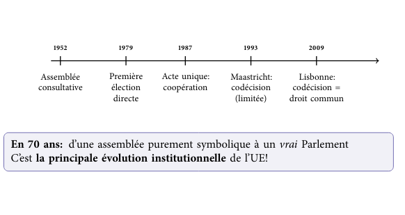 Une grande success story de l’institutionalisation au niveau européen. A passé de status consultatif genre un parlement ou les parlementaires nationaux vont quelques jours par an pour discuter de choses différentes à une institution où on fait du jeu politique non technocratique/ig/territoriale avec de la logique partisane. On arrive à un vrai parlement