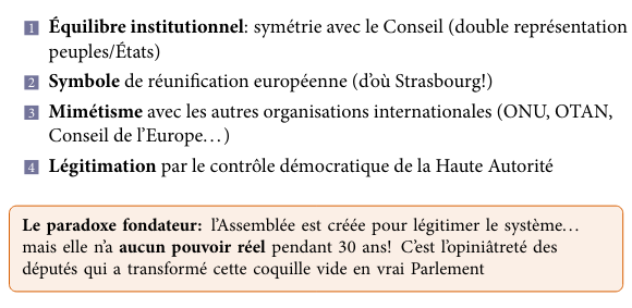 Au fur et mesure qu’on intègre plus on voulait la légitimité démocratique pour éviter le backlash à l’époque du postfonctionnalisme. Strasbourg comme symbole de paix (Alsace enjeu de tension).