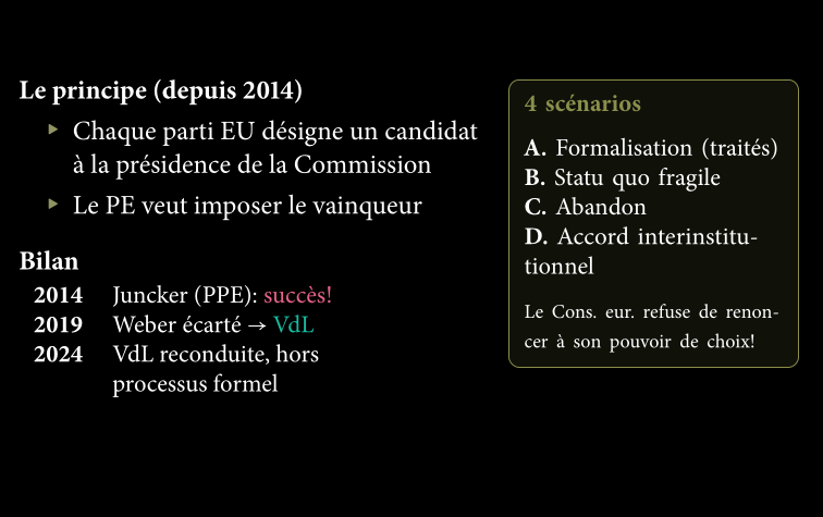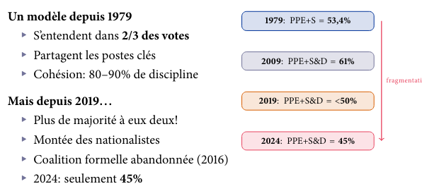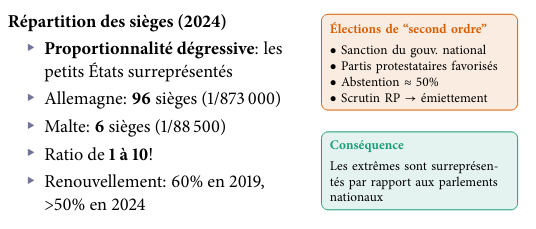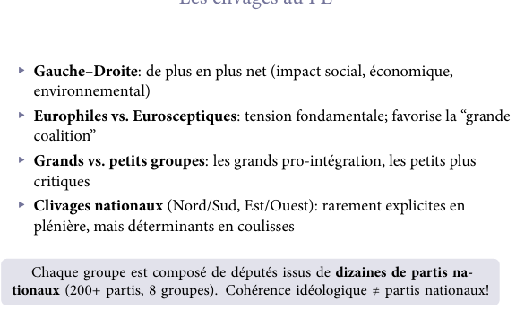 Maintenant beaucoup de parlementaires sont élus contre le gouvernement en place et cela ça rend confus leur mission. 2024 second ordre→Les partis eurosceptiques sont plus représentés qu’au niveau national ce qui crée des tensions pour des partis centristes : collaborer ou pas? Collaborer a été la fin de Weber comme président de la commission.